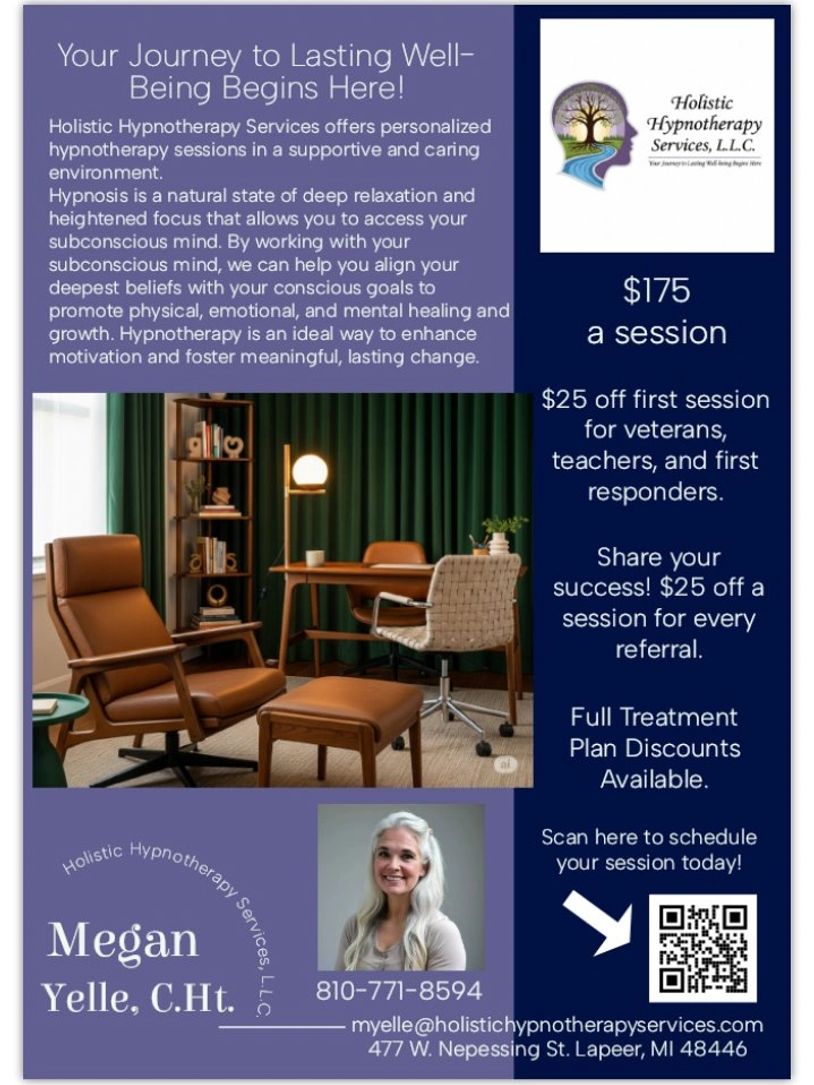 Drawing on a rich background in education and public service, Megan Yelle, C.Ht., is a certified hypnotherapist with a passion for helping people achieve their full potential. She holds two master's degrees from the University of Michigan, one in Liberal Studies in American Culture and another in Public Administration, which have shaped her deep understanding of human behavior and organizational dynamics.